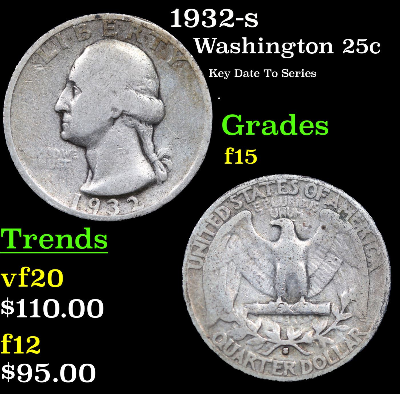 1932-s Washington Quarter 25c Grades f+. One of the Keys to the series. According to David Hall, from PCGS The 1932-s is the 2nd rarest of the Washington quarters. There are only two Washington quarters with mintages of under one million coins. The 1932-s has the lowest original mintage of 408,000. This coin is one of the most in-demand key dates of the 20th century. This is a date that has been sought after in all grades since the 1950's. Scarce in all grades.