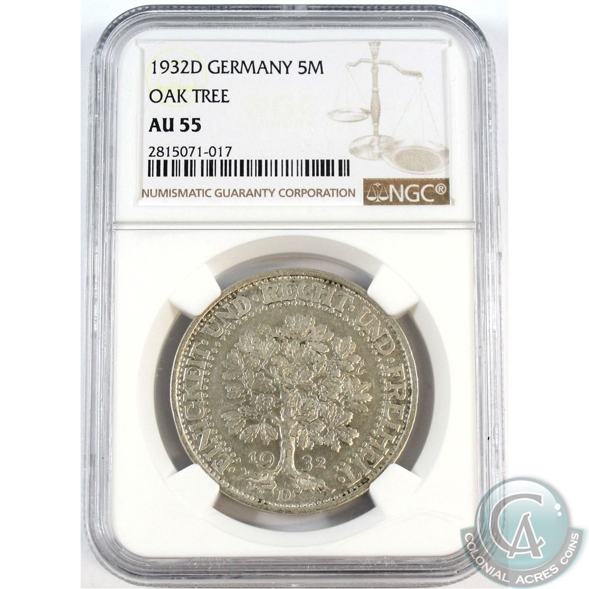 1932D Germany 5-Mark Oak Tree NGC Certified AU-55.