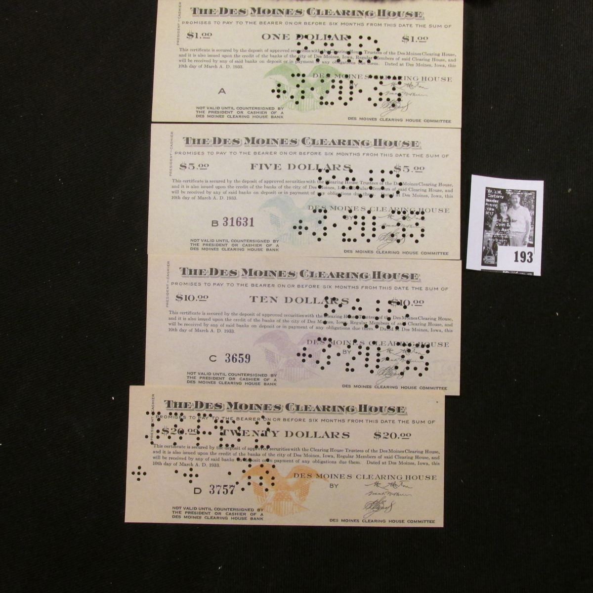1933 $1, $5, $10, & $20 "The Des Moines Clearing House" Depression Scrip, Hole cancelled.