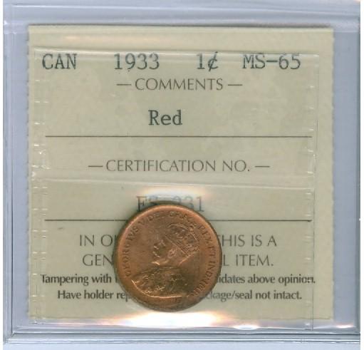 1933 1¢ ICCS MS65RD. Frosted 90% red finish.