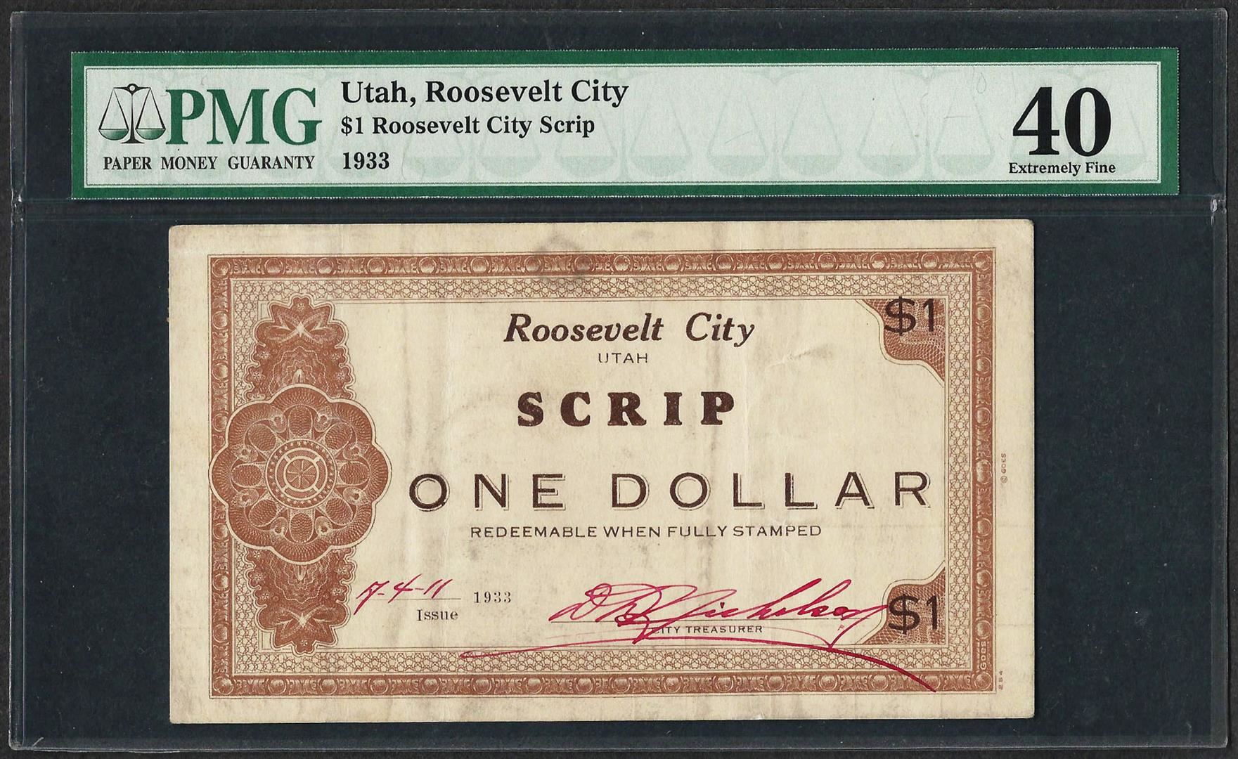 One 1933 $1 Roosevelt City Scrip Note PMG Extremely Fine 40. PMG Certified.