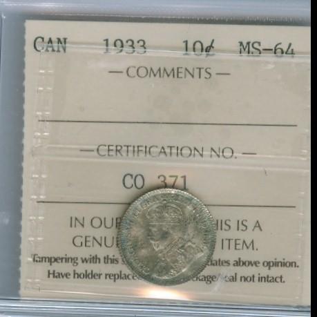1933 10¢ ICCS MS64, a nice type coin. Lightly toned.