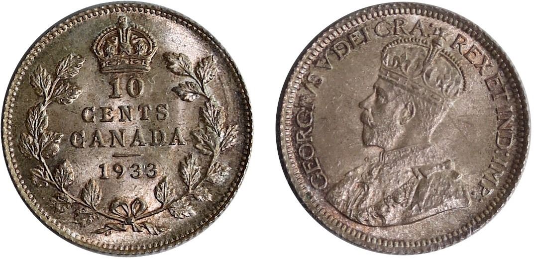 1933 10¢ ICCS/PCGS Very Choice Mint State-64 light autumn shades over full underlying lustre. A superior coin. Accompanied by PCGS tag.