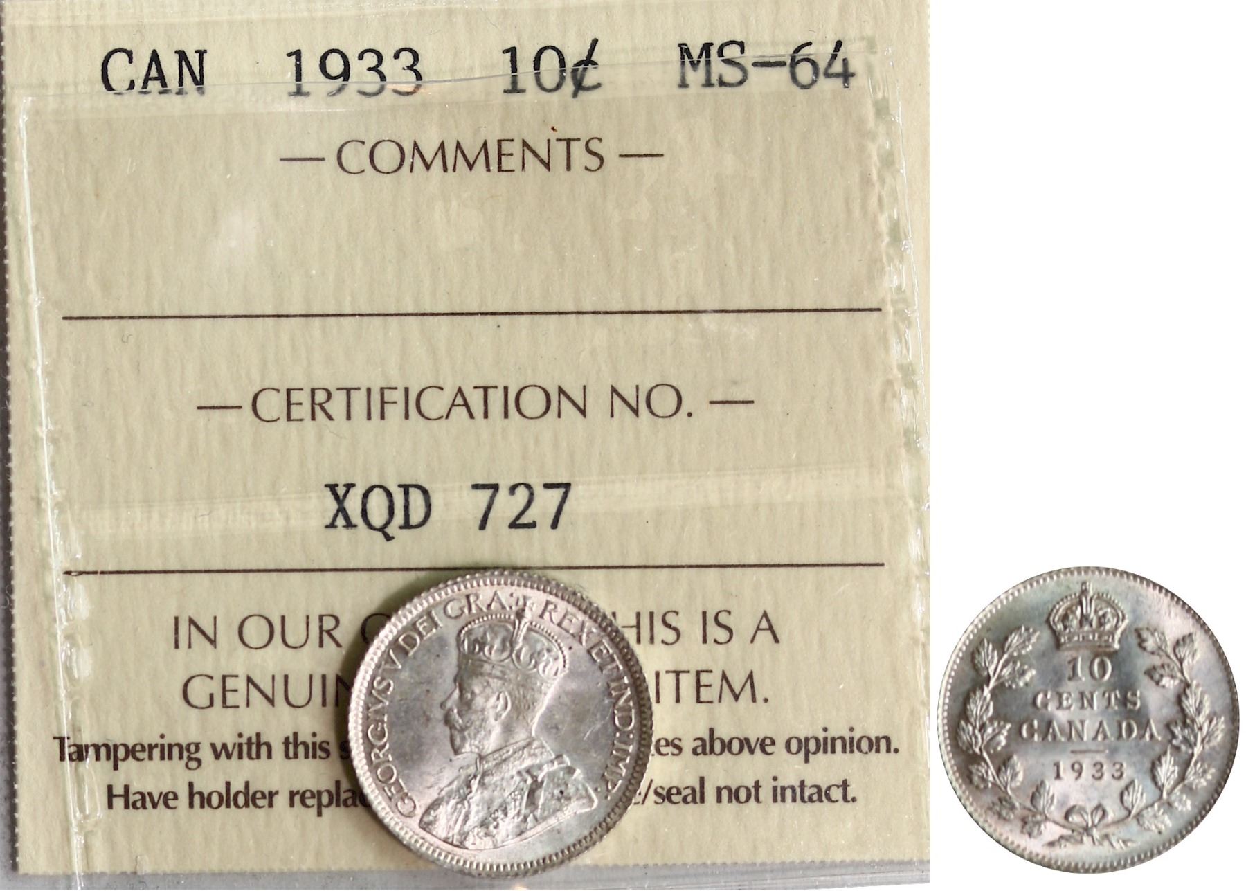 1933 10¢ ICCS Very Choice Mint State-64 Brilliant and lustrous. Scarce date.