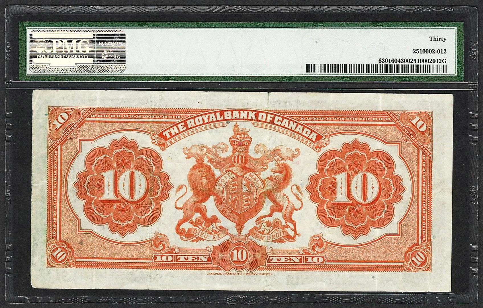 One 1933 $10 Montreal Royal Bank of Canada Note PMG Very Fine 30. PMG Certified.