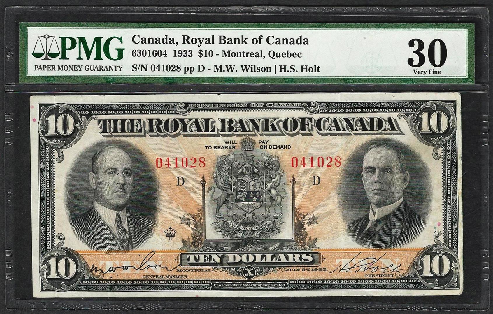 One 1933 $10 Montreal Royal Bank of Canada Note PMG Very Fine 30. PMG Certified.