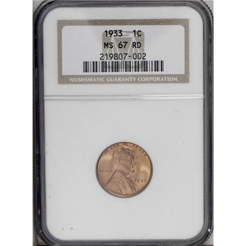 <B>1933<1C> MS67 Red NGC.</B></I> A charming orange-copper example of this Depression-era issue. Sharply struck with remarkably clean surfaces. Census: 23 in 67 Red, 0 finer (8/06).