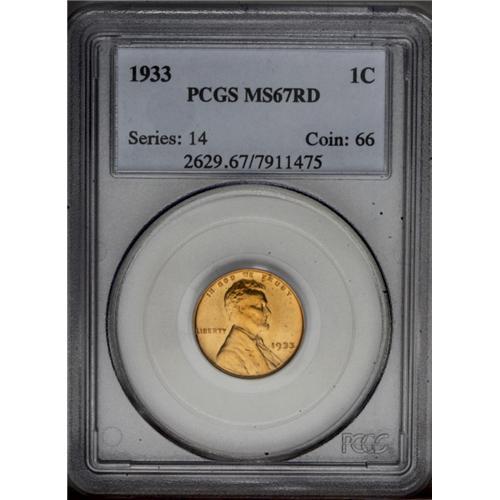 <B>1933<1C> MS67 Red PCGS.</B></I> A blazing Red coin that retains ample mint bloom and strong luster. The surfaces are clean and attractive. Lincoln's beard lacks the definition seen on other dates, perhaps the hub had worn out when this die was made. Orange-rose to Red on the reverse, with lighter yellow tints near the rim. Population: 31 in 67, 0 finer (3/06).<BR><I>From The Kendall Marie #4 All-Time Finest PCGS Registry of Lincoln Cents with Varieties, Circulation Strikes, 1909-1958.</B></I> <BR><BR><B>Important notice:</B> Heritage usually auctions material at the rate of 200-250 lots per hour. On some occasions eBay Live bid software or the Internet may not be able to keep up with the pace of the auction. We recommend placing a realistic absentee bid now as insurance to avoid disappointment. Occasionally the auctioneer may eliminate or reject an eBay Live bid, and the auctioneer may also reopen a lot after the close of the eBay live bidding (usually because we missed an audience bid), and may reject your bid even if it shows you as the winning bidder. By bidding via eBay Live, you agree that Heritage may award the lot to another bidder at its sole discretion under the circumstances described above or any other reasonable circumstances. Since eBay bids are not shown to us until we open the lot on the floor, we treat those bids just like floor bids. In most cases the floor responds before the eBay bid is presented to us, due to Internet lag time, so for consistency we have made it a policy that floor bids are always considered first over tie eBay live bids. Also please note that all Heritage lots purchased through eBay Live carry a 20% Buyer's Premium. Please make sure you read the Terms and Conditions before you bid. This lot is being auctioned in conjunction with a live floor auction by Heritage Galleries & Auctioneers. All final auction and invoice information will be supplied by Heritage Galleries & Auctioneers, and all other information should be considered preliminary. Lot:535 <BR><BR><B>Winning Notification and Billing:</B> After the FINAL session in this auction is complete, Heritage will send e-mail and snail mail invoices. This process normally takes several days. All final auction and invoice information will be supplied by Heritage Galleries & Auctioneers, and all other information should be considered preliminary. <BR><BR>This auction will be conducted on a live auction floor and over the Internet through eBay Live. If you choose to place an absentee bid, please take a moment to <font color='#0000ff'><u><a href='http://pages.ebay.com/liveauctions/help/before/laabsentee.html'>learn how eBay Live absentee bidding works</a></u></font><font color='#000000'>