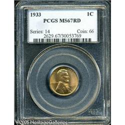 <B>1933 1C MS67 Red PCGS.</B></I> A dazzling Superb Gem that has radiant orange-red color and peerless fields. Just a few minuscule carbon flecks on the obverse can be detected under magnification. Population: 31 in 67, 0 finer (1/05). Lot:5531