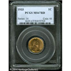 1933 1C MS67 Red PCGS. A lustrous and sharply stru <B>1933 1C MS67 Red PCGS.</B></I> A lustrous and sharply struck Gem with impressive preservation and glorious reddish-gold color. Population: 30 in 67, 0 finer (10/04). <BR><BR><B>Important notice:</B> Heritage usually auctions material at the rate of 200-250 lots per hour. On some occasions eBay Live bid software or the Internet may not be able to keep up with the pace of the auction. We recommend placing a realistic absentee bid now as insurance to avoid disappointment. Occasionally the auctioneer may eliminate or reject an eBay Live bid, and the auctioneer may also reopen a lot after the close of the eBay live bidding (usually because we missed an audience bid), and may reject your bid even if it shows you as the winning bidder. By bidding via eBay Live, you agree that Heritage may award the lot to another bidder at its sole discretion under the circumstances described above or any other reasonable circumstances. Since eBay bids are not shown to us until we open the lot on the floor, we treat those bids just like floor bids. In most cases the floor responds before the eBay bid is presented to us, due to Internet lag time, so for consistency we have made it a policy that floor bids are always considered first over tie eBay live bids. Also please note that all Heritage lots purchased through eBay Live carry a 20% Buyer's Premium. Please make sure you read the Terms and Conditions before you bid. This lot is being auctioned in conjunction with a live floor auction by Heritage Galleries & Auctioneers. All final auction and invoice information will be supplied by Heritage Galleries & Auctioneers, and all other information should be considered preliminary. Lot:5329