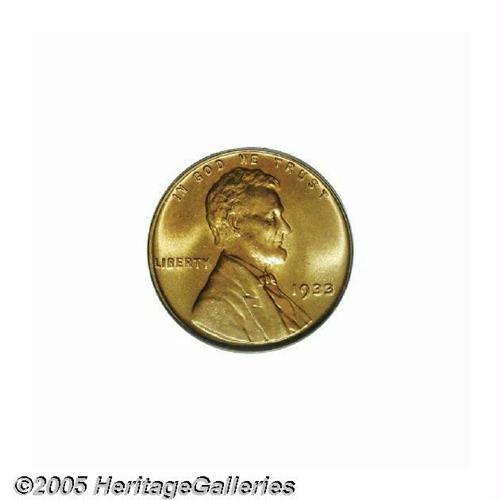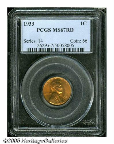 <B>1933<1C> MS67 Red PCGS.</B></I> One of the most attractive Lincoln cents that we have examined recently, this exquisitely preserved Superb Gem displays rich, effulgent luster and bright, even orange-red toning across both sides. The striking details are sharp throughout, and only a few of the most minute of marks seem evident, on the obverse, using magnification. The reverse is virtually pristine. A beautiful and technically impressive example. Population: 31 in 67 Red, 0 finer at either service (6/05).<BR><I>From The William Bickel Collection, Part One.</B></I>