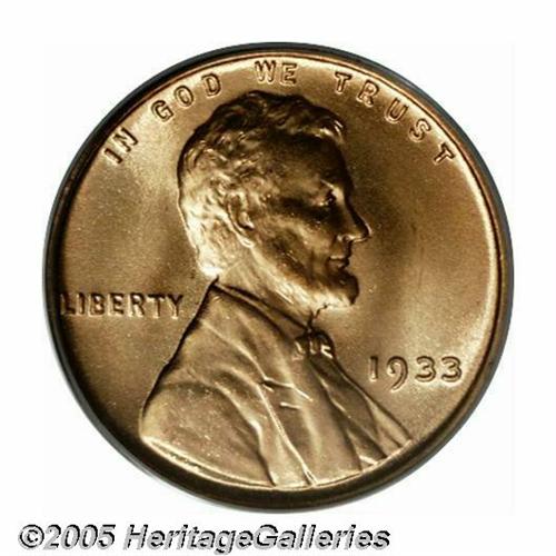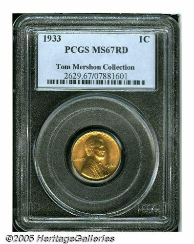 <B>1933<1C> MS67 Red PCGS.</B></I> Well struck and fully lustrous, with bright mint red color and splashes of reddish-golden patina on each side. The impressively preserved surfaces only show a few trivial contact marks. The relatively low mintage of this issue, for a Philadelphia Lincoln Cent, has left the 1933 as a scarcer date within the series, with a small overall population in Mint State. Just 53 pieces have been graded as Superb Gems, through the combined efforts of NGC and PCGS, with none finer (3/05).<BR><I>From The Tom Mershon #2 All-Time PCGS Registry Set of Lincoln Wheat Cents.</B></I>