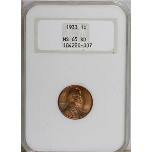 <B>1933 1C MS65 Red NGC.</B></I> NGC Census: (138/183). PCGS Population (356/252). Mintage: 14,360,000. Numismedia Wsl. Price for NGC/PCGS coin in MS65: $62. (#2629)<BR><BR><B>Coin Engraver:</B> Victor D. Brenner<BR><BR><b>Shipping:</b> Coins & Currency (<a target="_blank" href="http://www.heritageauctions.com/common/shipping.php">view shipping information</a>\)