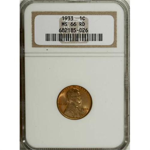 <B>1933 1C MS66 Red NGC.</B></I> NGC Census: (162/23). PCGS Population (254/31). Mintage: 14,360,000. Numismedia Wsl. Price for NGC/PCGS coin in MS66: $185. (#2629)<BR><BR><B>Coin Engraver:</B> Victor D. Brenner<BR><BR><b>Shipping:</b> Coins & Currency (<a target="_blank" href="http://www.heritageauctions.com/common/shipping.php">view shipping information</a>)