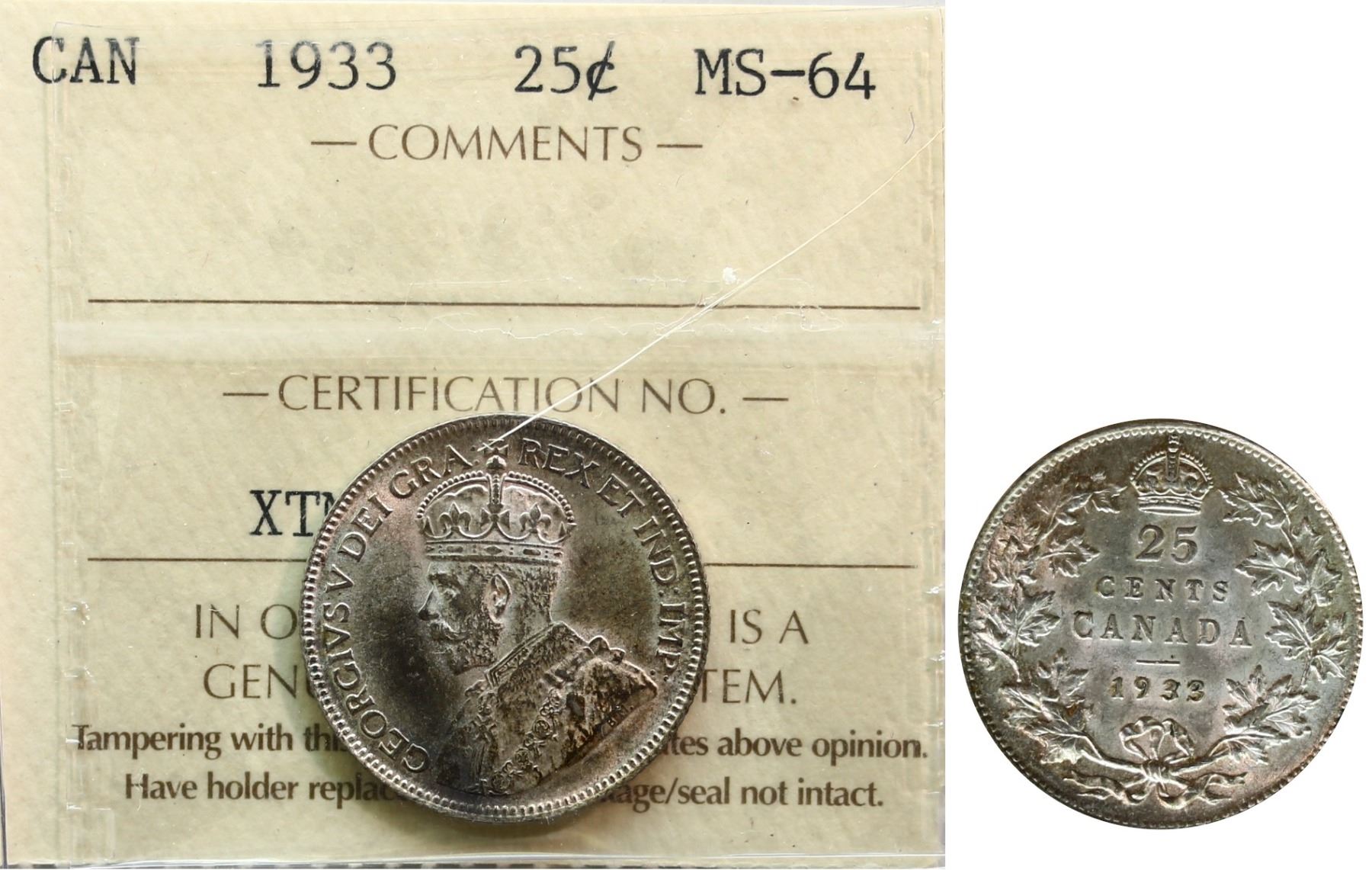 1933 25¢ ICCS Choice Mint State-64. A nice and lustrous example with light toning.