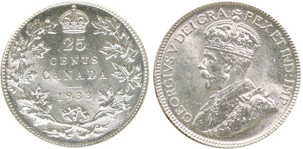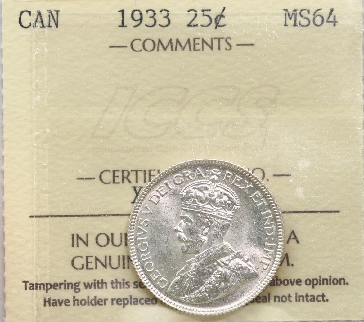 1933 25¢ ICCS Choice Mint State-64 Blast white example with great eye appeal.
