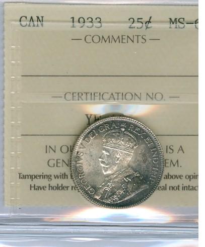 1933 25¢ ICCS MS63. Strong strike and lustre.