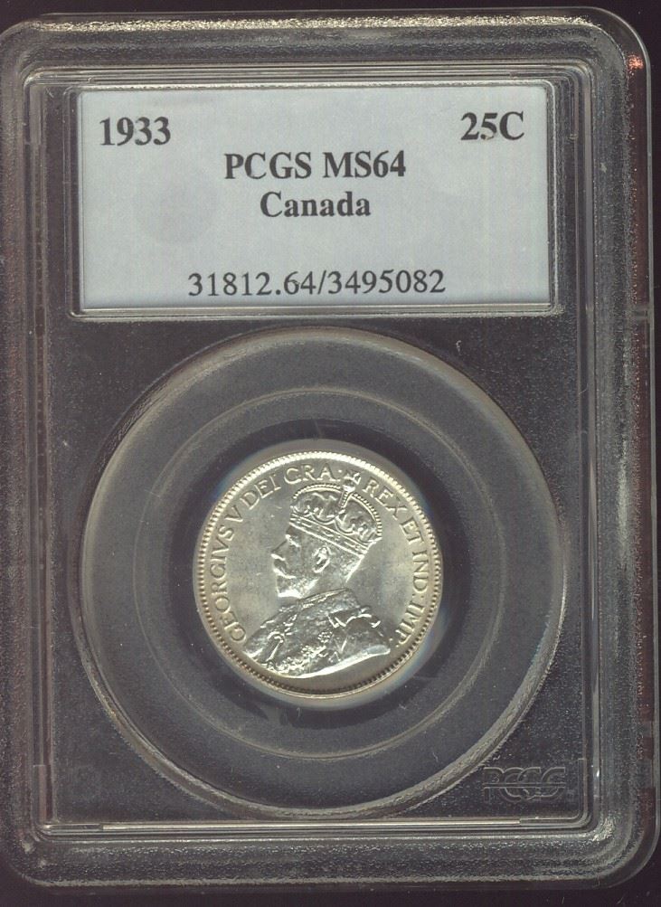 1933 25¢ PCGS MS64. PQ lustrous issue.