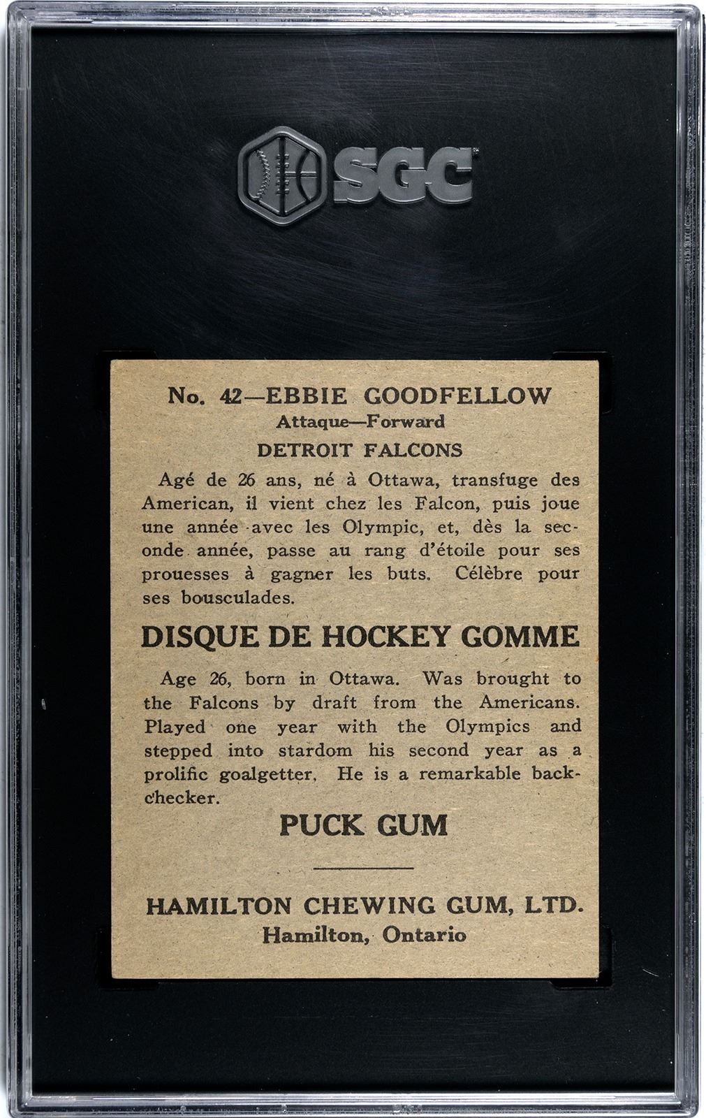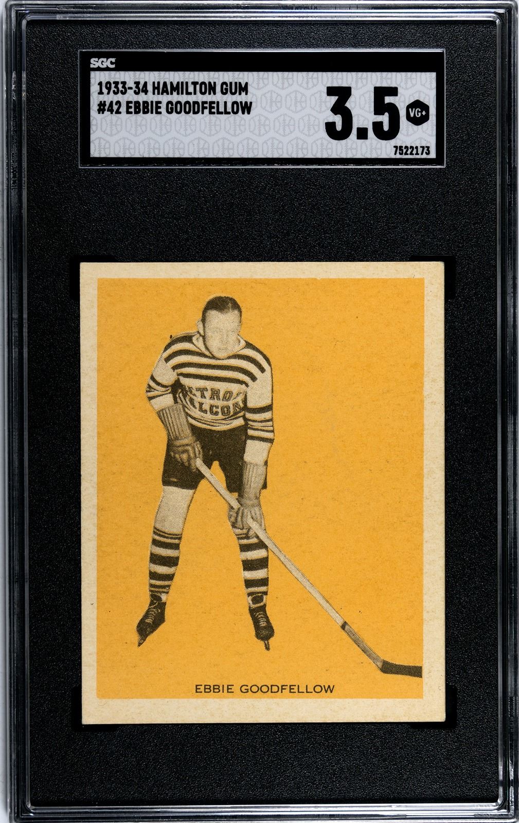 Hall of Famer Goodfellow played both forward and defense, won an MVP, was captain of the Red Wings, and won 3 Stanley Cups. This one, from the 1933 Hamilton Gum set, grades a strong 3.5 VG+ by SGC with plenty of eye appeal for the grade. This is 1 of 2 with only 3 graded higher in the SGC database.