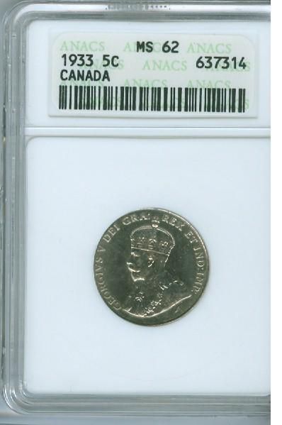 1933 5¢ ANACS MS62. Lustrous with all 8 beads visible.