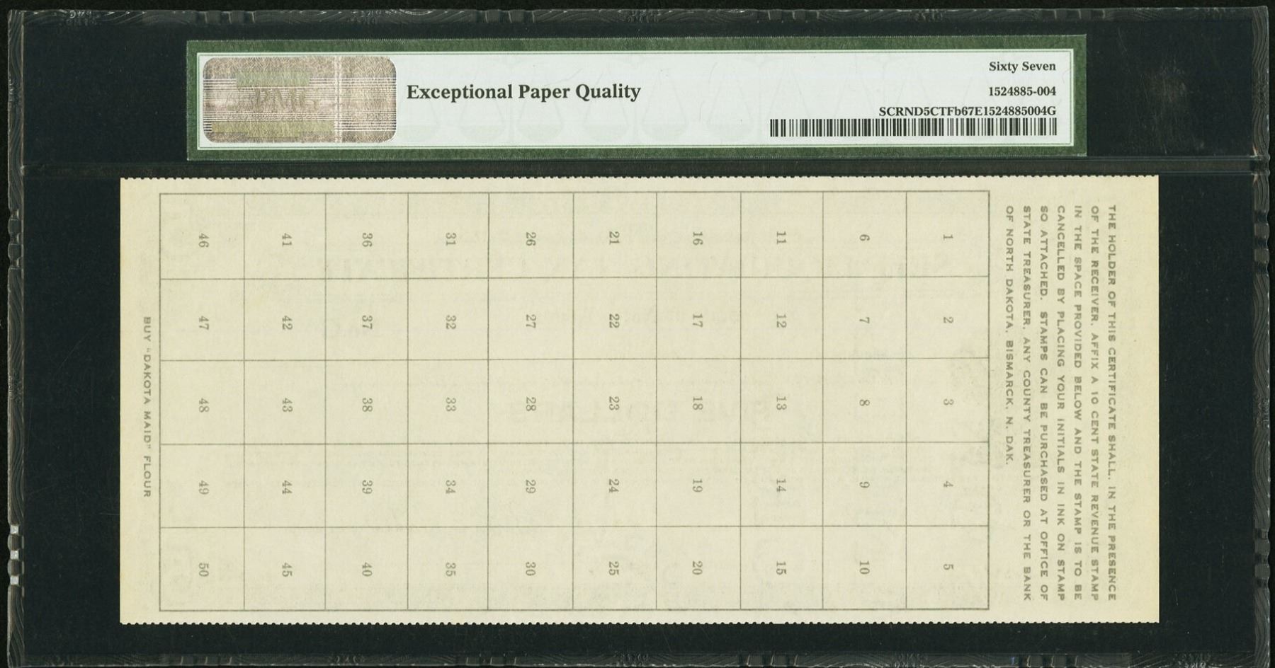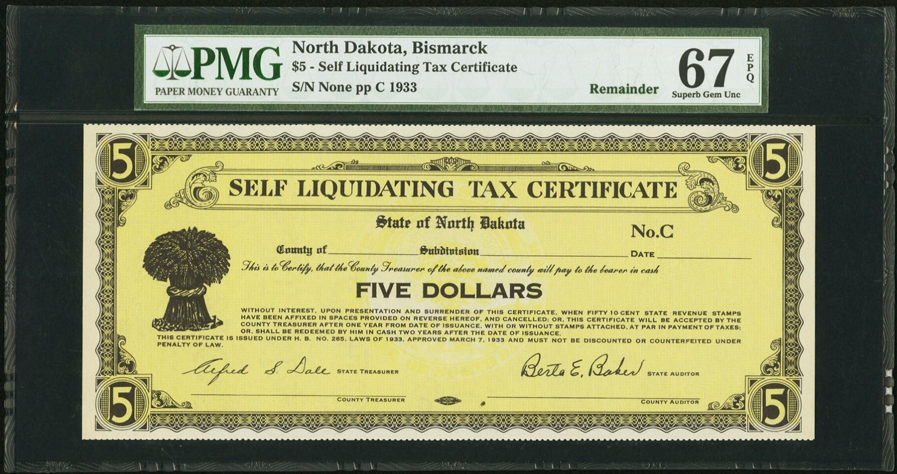 One 1933 $5 Bismarck ND Self Liquidating Tax Cert PMG 67EPQ.