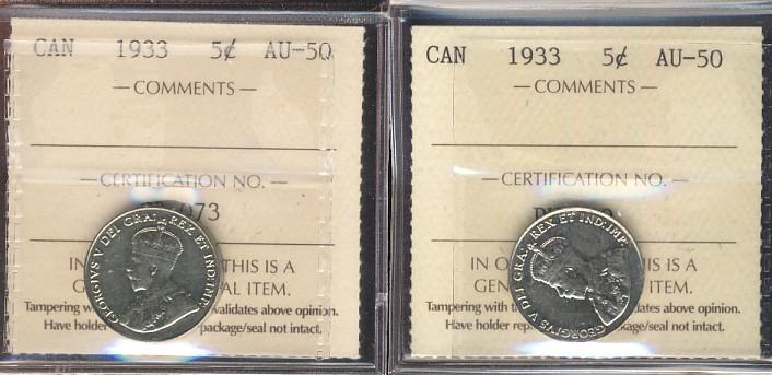1933 5¢ ICCS AU50. Lot of 2 coins.