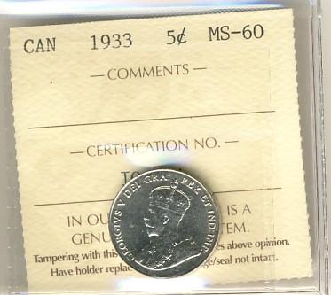 1933 5¢ ICCS MS60. Extremely tough date to find in Mintstate condition.