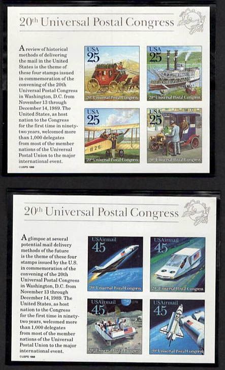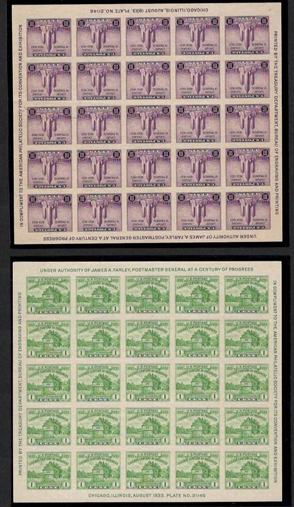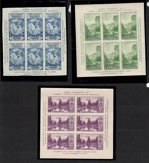 1933-89, a group of 7 souvenir sheets. Scott 730//C126a. Including 1933, 1¢ A.P.S., souvenir sheet of 25, 1933, 3¢ A.P.S., souvenir sheet of 25, 1934, National Stamp Exhibition, souvenir sheet of 6, 1934, 3¢ A.P.S., souvenir sheet of 6, 1934, 1¢ Trans-Mississippi Philatelic Exposition, souvenir sheet of 6, 1989, UPU Congress, souvenir sheet of 4 and Airmail, 1989, 45¢ U.P.U. Congress, single from souvenir sheet, VF-XF