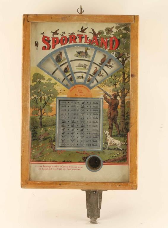 'Sportland' Trade Stimulator 5¢ coin operation with red, blue and green painted wood. 'A.B.T Manufacturing Co. Chicago USA' on right and left sides. Displays a hunter with raised rifle and his hunting dog. Different combinations of game reward player with shells. Measures 16"l x 10 3/4"w x 5 5/8"h. Some waving on interior paper display due to age.