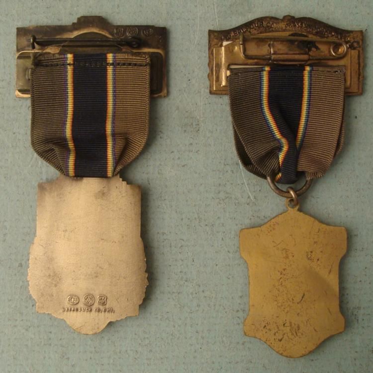HERE ARE TWO AMERICAN LEGION VINTAGE CONVENTION BADGES FROM 1933 AND 1939, LT COMMANDERS. THEY BOTH ARE OLD BADGES WITH ENAMEL & BRASS. ON THE REVERSE IS THE MAKER'S MARK. *