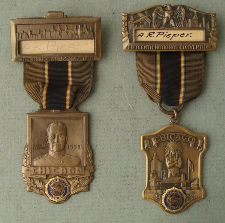 HERE ARE TWO AMERICAN LEGION VINTAGE CONVENTION BADGES FROM 1933 AND 1939, LT COMMANDERS. THEY BOTH ARE OLD BADGES WITH ENAMEL & BRASS. ON THE REVERSE IS THE MAKER'S MARK.