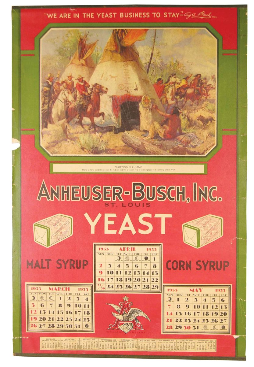 1933 Calendar page for Anheuser Busch Yeast. Entitled, Surprising the Camp. Metal bands, top and bottom. Some minor paper loss and tears around perimeter otherwise very good condition. 14 X 21 1/4 inches.