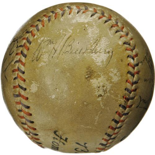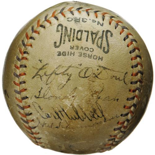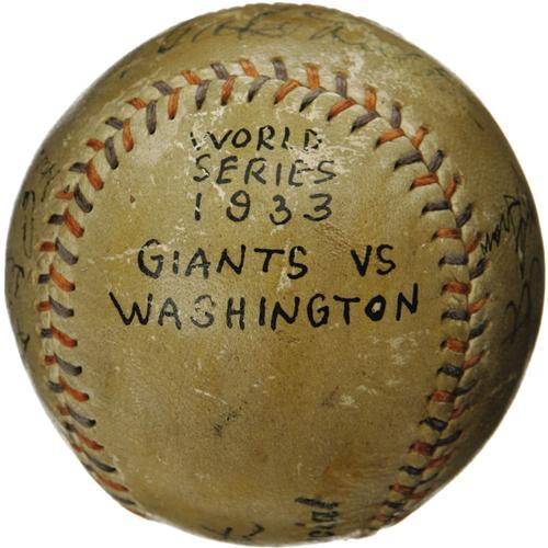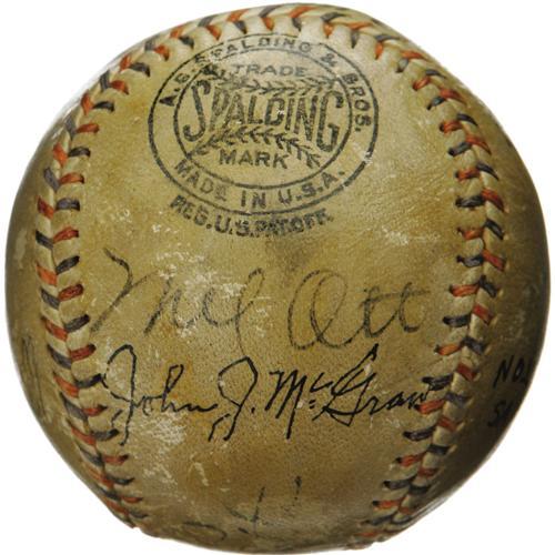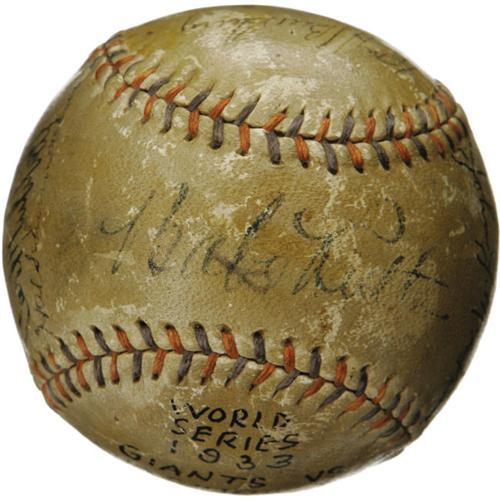 <B>1933 Babe Ruth, Mel Ott, John McGraw Signed Baseball.</B></I> We have Christy Walsh, generally considered to be America's first sports agent, to thank for this fantastic sphere, originally created for a lucky VIP at the 1933 World Series. Walsh was known for autographed keepsakes such as these, affixing a signed baseball to an ink blotter to serve as a unique desk accessory for his powerful friends. While the blotter is long gone, the all-important "Babe Ruth Home Run Special" baseball remains, adorned with eight autographs from the elite athletes in attendance. Most notable is Walsh's prized client Babe Ruth himself, who occupies his typical sweet spot position. To the east, we encounter twin Giants Mel Ott and John McGraw, who would conquer the Washington Senators that October. McGraw signature is enhanced. Fellow Polo Grounds Hall of Famer Carl Hubbell joins Lefty O'Doul, Blondy Ryan and Hal Schumacher to the west. A final Giant of Cooperstown, Bill Terry, is due north. A bold block lettered notation reading "World Series 1933, Giants vs. Washington" is to the south. The mounting hole from the ball's application to an ink blotter remains well clear of all writing. A thin coating of shellac and moderate surface wear must be noted, but all autographs remain readily legible, ranging in strength from 5/10 to 9/10. <I>LOA from PSA/DNA. LOA from James Spence Authentication.</B></I><BR><BR><b>Shipping:</b> Balls, Pucks, etc., Small (<a target="_blank" href="http://www.heritageauctions.com/common/shipping.php">view shipping information</a>)