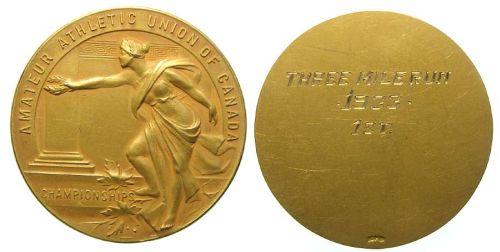 Canada, gold medal for running, 1933. Obverse: Classical style lady holding a wreath in front of a Greek style column, with AMATEUR ATHLETIC UNION OF CANADA, CHAMPIONSHIPS. Reverse: hand engraved with THREE MILE RUN, 1933 1st and stamped with a 10k mark,
