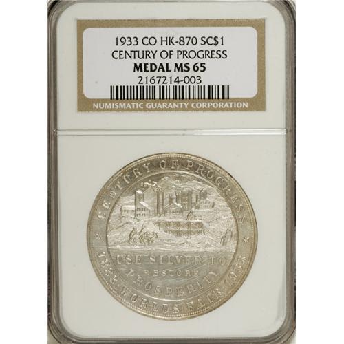 <B>1933 Century of Progress MS65 NGC.</B></I> CO/IL HK-870. Silver, Type IV. A precisely struck Gem that appears as made aside from a hint of chestnut toning. One of four varieties of one-ounce silver pieces ordered by Colorado businessmen and offered at the Chicago Century of Progress Exposition.<BR><BR><b>Shipping:</b> Coin/Currency (<a target="_blank" href="http://www.heritageauctions.com/common/shipping.php">view shipping information</a>)