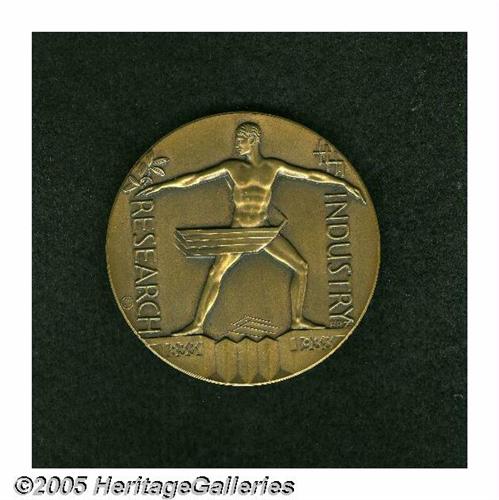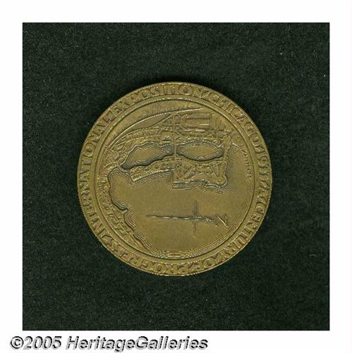 <B>1933 Century of Progress Medal PR64 Uncertified.</B></I> Bronze. 57 mm. This large-sized medal has the same design as the smaller-sized version above. However, the box is not in as good shape as the smaller version, this box grading Fine or so with several obvious defects. The medal actually does not fit well in the box any longer, and as a result just the slightest friction can be seen on the highpoints of the design. Nevertheless, these are two really cool medals that a serious medal collector would be glad to add to his or her collection.