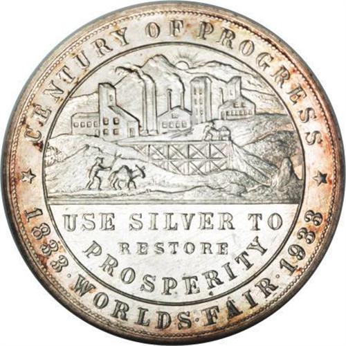 <B>1933 Century of Progress So-Called Dollar, CO HK-870, MS64 NGC.</B></I> Silver. A reported 10,000 pieces were struck (Hibler-Kappen, 1963). Wisps of gold-tan toning concentrate at the borders of this near-Gem<BR><BR><b>Shipping:</b> Coins & Currency (<a target="_blank" href="http://www.heritageauctions.com/common/shipping.php">view shipping information</a>)