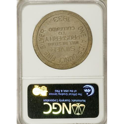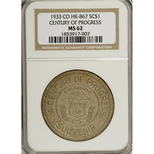 <B>1933 Colorado's Century of Progress So-Called Dollar MS62 NGC.</B></I> HK-867. An original piece that exhibits overall gray toning and is devoid of the normal contact marks. This is the Type I piece, listed as "rare" in Hibler-Kappen, with a 1963 market value of $125.<BR><BR><b>Shipping:</b> Coins & Currency (<a target="_blank" href="http://www.heritageauctions.com/common/shipping.php">view shipping information</a>)