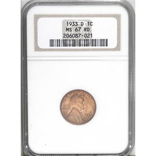 <B>1933-D<1C> MS67 Red NGC.</B></I> Remarkably preserved for this desirable Depression-era issue. Fiery red color gives way to small blushes of lime-green iridescence on each side. Population: 36 in 67, none finer (8/06).<BR><I>From The Tigard Oregon Small Cent Collection.</B></I>