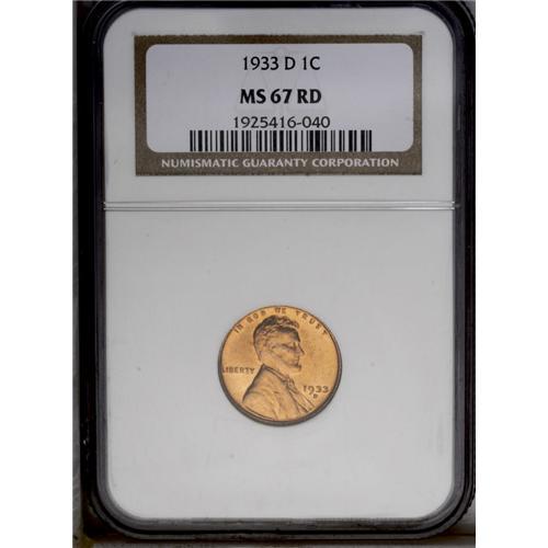 <B>1933-D<1C> MS67 Red NGC.</B></I> A fiery Superb Gem with radiant orange color and no mentionable distractions on either side. Census: 33 in 67, none are finer at either service (3/06). <BR><BR><B>Important notice:</B> Heritage usually auctions material at the rate of 200-250 lots per hour. On some occasions eBay Live bid software or the Internet may not be able to keep up with the pace of the auction. We recommend placing a realistic absentee bid now as insurance to avoid disappointment. Occasionally the auctioneer may eliminate or reject an eBay Live bid, and the auctioneer may also reopen a lot after the close of the eBay live bidding (usually because we missed an audience bid), and may reject your bid even if it shows you as the winning bidder. By bidding via eBay Live, you agree that Heritage may award the lot to another bidder at its sole discretion under the circumstances described above or any other reasonable circumstances. Since eBay bids are not shown to us until we open the lot on the floor, we treat those bids just like floor bids. In most cases the floor responds before the eBay bid is presented to us, due to Internet lag time, so for consistency we have made it a policy that floor bids are always considered first over tie eBay live bids. Also please note that all Heritage lots purchased through eBay Live carry a 20% Buyer's Premium. Please make sure you read the Terms and Conditions before you bid. This lot is being auctioned in conjunction with a live floor auction by Heritage Galleries & Auctioneers. All final auction and invoice information will be supplied by Heritage Galleries & Auctioneers, and all other information should be considered preliminary. Lot:669 <BR><BR><B>Winning Notification and Billing:</B> After the FINAL session in this auction is complete, Heritage will send e-mail and snail mail invoices. This process normally takes several days. All final auction and invoice information will be supplied by Heritage Galleries & Auctioneers, and all other information should be considered preliminary. <BR><BR>This auction will be conducted on a live auction floor and over the Internet through eBay Live. If you choose to place an absentee bid, please take a moment to <font color='#0000ff'><u><a href='http://pages.ebay.com/liveauctions/help/before/laabsentee.html'>learn how eBay Live absentee bidding works</a></u></font><font color='#000000'>
