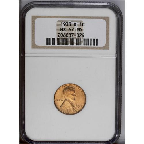 <B>1933-D<1C> MS67 Red NGC.</B></I> A sharply struck Superb Gem that has extravagant luster and beautiful color. The reverse has a few trivial marks unworthy of individual mention. Neither NGC nor PCGS has certified a finer example in the color category (8/06).
