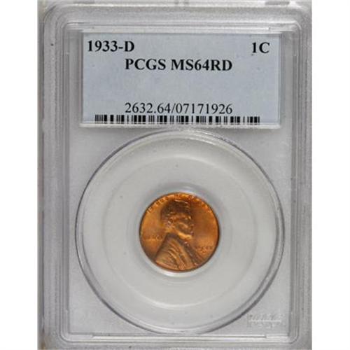 <B>1933-D 1C MS64 Red PCGS.</B></I> PCGS Population (267/814). NGC Census: (121/567). Mintage: 6,200,000. Numismedia Wsl. Price for NGC/PCGS coin in MS64: $38. (#2632)<BR><BR><B>Coin Engraver:</B> Victor D. Brenner<BR><BR><b>Shipping:</b> Coins & Currency (<a target="_blank" href="http://www.heritageauctions.com/common/shipping.php">view shipping information</a>)
