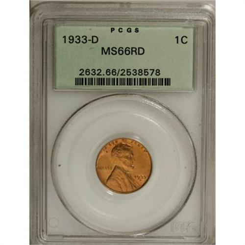 <B>1933-D 1C MS66 Red PCGS.</B></I> . PCGS Population (293/19). NGC Census: (261/36). Mintage: 6,200,000. Numismedia Wsl. Price for NGC/PCGS coin in MS66: $365. (#2632)<BR><BR><B>Coin Engraver:</B> Victor D. Brenner<BR><BR><b>Shipping:</b> Coins & Currency (<a target="_blank" href="http://www.heritageauctions.com/common/shipping.php">view shipping information</a>)