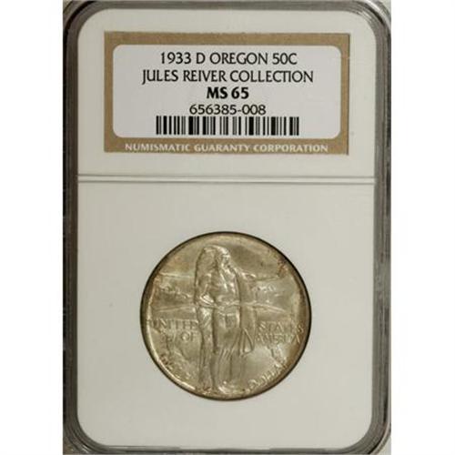 <B>1933-D 50C Oregon MS65 NGC.</B></I> Ex Jules Reiver Collection. NGC Census: (376/231). PCGS Population (694/364). Mintage: 5,008. Numismedia Wsl. Price for NGC/PCGS coin in MS65: $440. (#9343)<BR><BR><b>Shipping:</b> Coins & Currency (<a target="_blank" href="http://www.heritageauctions.com/common/shipping.php">view shipping information</a>)
