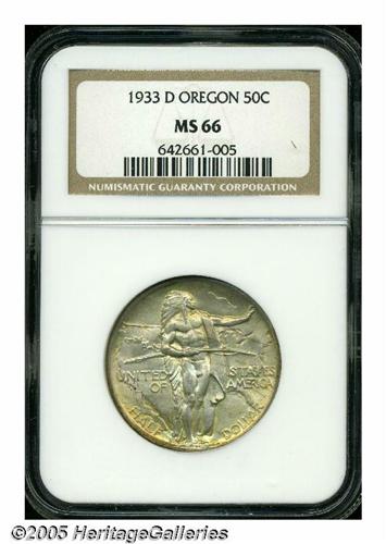 <B>1933-D<50C> Oregon MS66 NGC.</B></I> Fully struck and lustrous with attractive, uniform medium amber and steel-gray patina. Only 5,008 pieces were struck of this scarce and desirable issue.