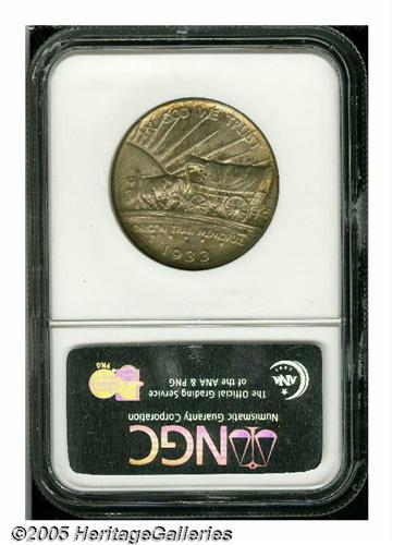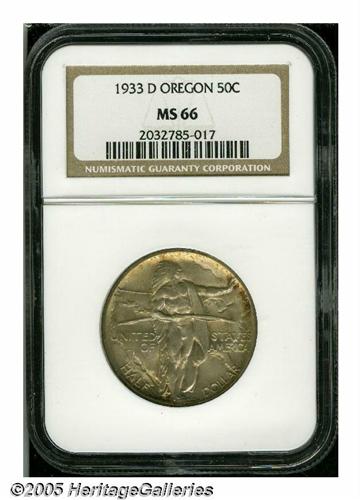 <B>1933-D<50C> Oregon MS66 NGC.</B></I> Lavender and golden-brown colors bathe this lustrous and reasonably struck premium Gem. The obverse legends are strongly die doubled, as always. The first Denver Mint Commemorative issue, and one of the few denominations struck by the Denver Mint in the Great Depression year of 1933.<BR><I>From the Dr. Kurt Peters Collection.</B></I> From the Dr. Kurt Peters Collection.