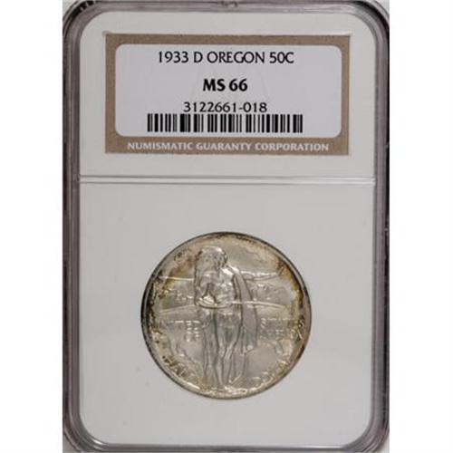 <B>1933-D 50C Oregon MS66 NGC.</B></I> Splashes of red-gold color make occasional visits to the highly lustrous, well preserved surfaces of this Premium Gem. A well executed strike sharpens the design features.<BR><I>From The John Stimson, Sr. Collection, Part Two.</B></I><BR><BR><b>Shipping:</b> Coins & Currency (<a target="_blank" href="http://www.heritageauctions.com/common/shipping.php">view shipping information</a>)