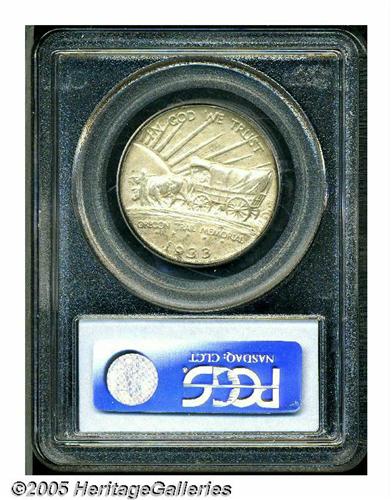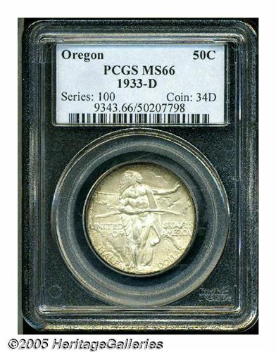 <B>1933-D<50C> Oregon MS66 PCGS.</B></I> Lustrous surfaces display light gray patina, imbued with speckles of reddish-gold and olive at the peripheries, and the design features are well impressed. There are no mentionable marks to report. Population: 267 in 66, 0 finer (5/05).