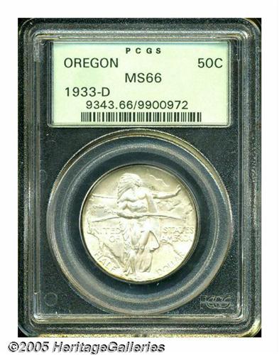<B>1933-D<50C> Oregon MS66 PCGS.</B></I> Splendid powder-blue, peach, and gunmetal-gray colors dominate this satiny premium Gem. Glimpses of golden-brown patina adorn the margins. The back of the wagon is not completely brought up by the dies, however, the preservation is impressive. In a green label holder.