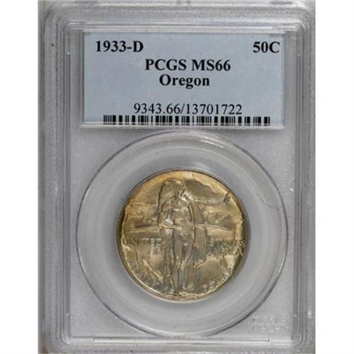 <B>1933-D 50C Oregon MS66 PCGS.</B></I> PCGS Population (304/62). NGC Census: (206/25). Mintage: 5,008. Numismedia Wsl. Price for NGC/PCGS coin in MS66: $690. (#9343)<BR><BR><b>Shipping:</b> Coins & Currency (<a target="_blank" href="http://www.heritageauctions.com/common/shipping.php">view shipping information</a>)
